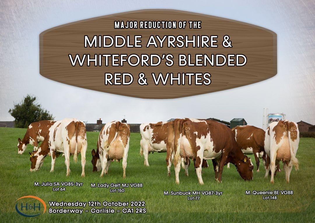 The Whiteford family from Middle Farm near Brampton sold an outstanding group of cows from their impressive Ayrshire and Blended Red & White herd. Years of expertise and astute breeding decisions was clearly evident when you viewed this herd of balanced dairy cows. They were uniform with exceptional rumps and strong toplines and the strength of the feet and legs was at a high level and the quality of the udders was amazing.