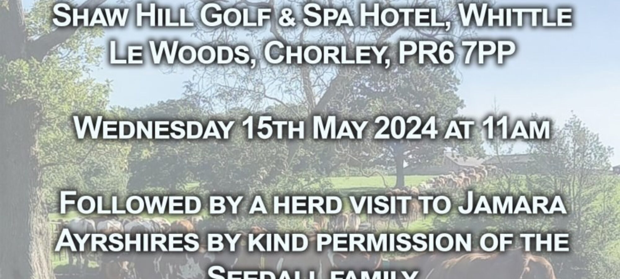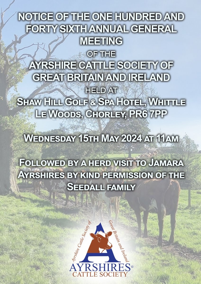 NOTICE OF THE ONE HUNDRED AND FORTY SIXTH ANNUAL GENERAL MEETING of the AYRSHIRE CATTLE SOCIETY OF GREAT BRITAIN AND IRELAND to be held at Shaw Hill Golf & Spa Hotel, Whittle Le Woods, Chorley, PR6 7PP on Wednesday 15th May 2024 at 11am.